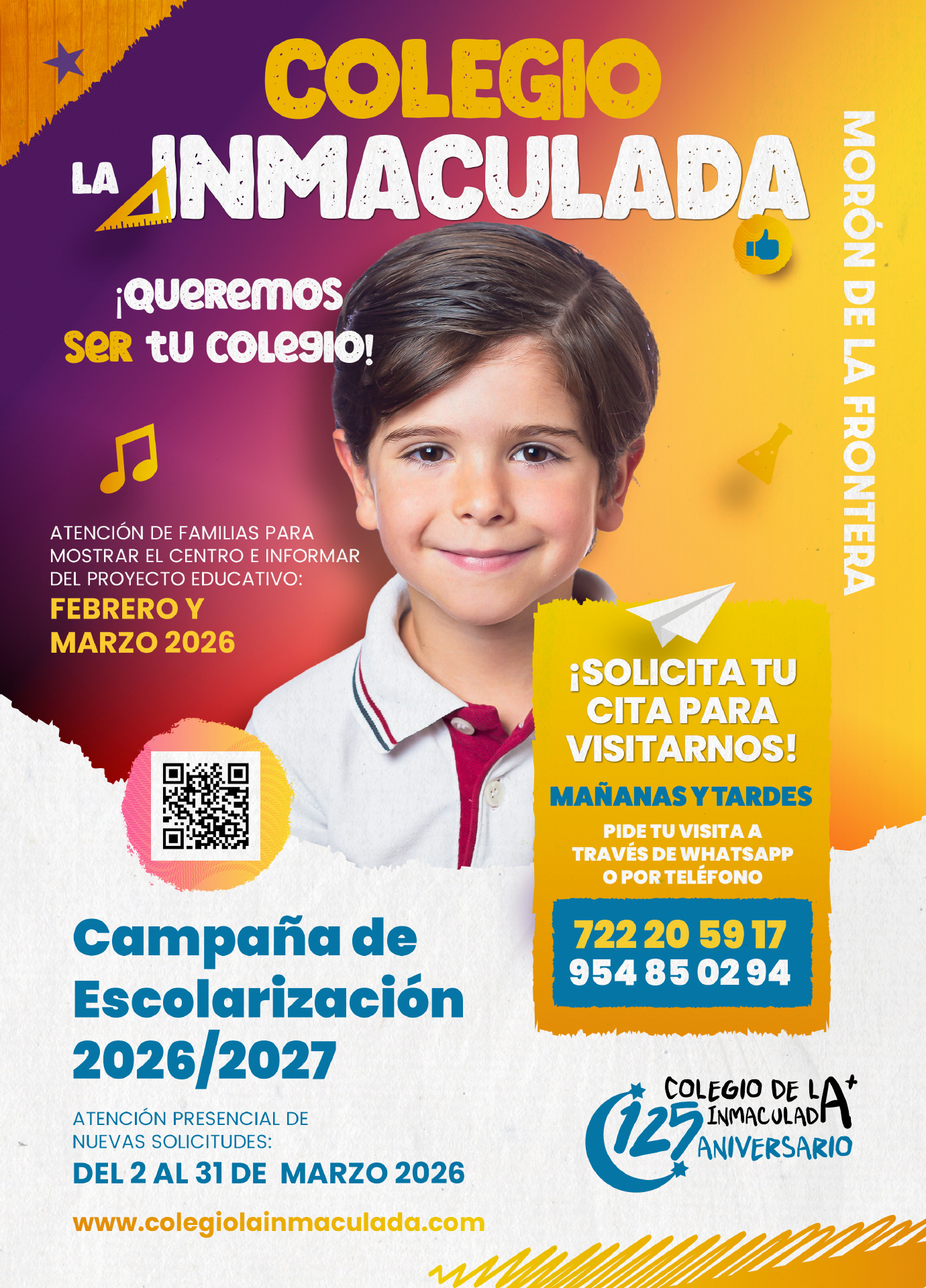 Así hemos titulado la exposición fotográfica gratuita del colegio La Inmaculada de Morón, que celebraremos en la Casa de la Cultura de nuestra localidad, desde el 26 septiembre al 17 octubre 2025, en horario de lunes a viernes, de 8:00 a 15:00 horas y de 16:00 a 21:00 horas. Desde aquí invitamos a todas las familias, antiguos alumnos/as y público en general para acompañarnos en este bonito recorrido fotográfico por 125 años de historia. ¡Os esperamos!