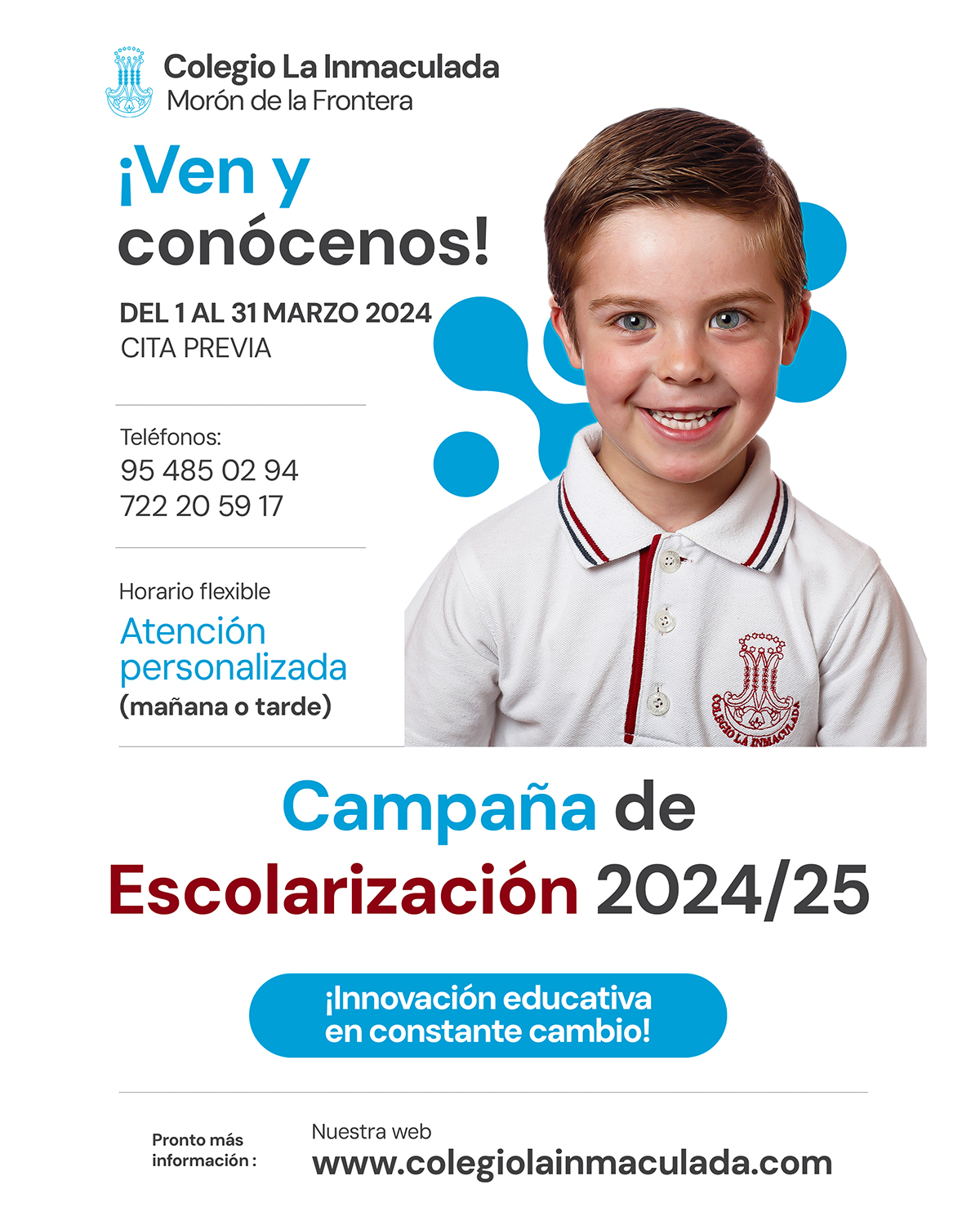 El mes de febrero es muy importante para aquellas familias que estén pensando en realizar la solicitud de escolarización en nuestro centro a partir del 1 de marzo 2024. De hecho…¡ya lo tenemos todo casi preparado para recibirles en horario flexible de mañana y tarde, informándoles y acompañándoles por nuestro colegio, lleno siempre de novedades y nuevos proyectos educativos! En nuestra web www.colegiolainmaculada.com aparecerán en breve anuncios y cartelería alusiva, y nuestro teléfono del centro 954850294 y nuestra atención por WhatsApp en el 722205917 estarán operativas para facilitar al máximo esta importante cita con el futuro escolar de vuestros hijos/as. ¡Os esperamos!