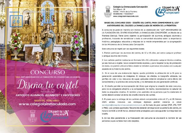Ya podéis acceder a las bases del concurso organizado por el COLEGIO LA INMACULADA DE MORÓN DE LA FRONTERA para diseñar un cartel con motivo del "125º ANIVERSARIO DE LA FUNDACIÓN DEL COLEGIO MIC EN MORÓN DE LA FRONTERA". Podrán participar antiguos alumnos, alumnos actuales* y profesores del centro. Se puede utilizar cualquier técnica creativa, ya sea manual o digital. Los premios, formatos de entrega y requisitos podéis descargarlos desde nuestra web www.colegiolainmaculada.com ¡Esperamos vuestra participación!